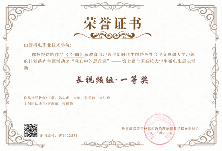 2024年3月,我院思政微电影《乡·晴》荣获教育部习近平新时代中国特色社会主义思想大学习领航计划系列主题活动之“我心中的思政课”——第七届全国高校大学生微电影展示活动长视频组·一等奖。这是我校参加该项比赛以来获得的最好成绩,也是全省高校参加该项赛事以来取得的最高奖项。